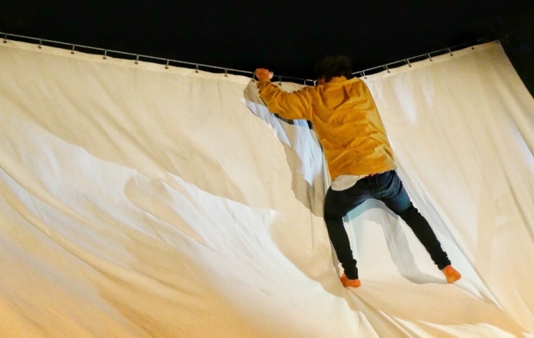 Double You is a circus performance based on the Fear of Missing Out. Five talented artists share two stages, separated by a fabric wall with the audience seated on either side. Shadows and sounds permeate the wall. Why are they laughing over there? What am I missing on that side?
