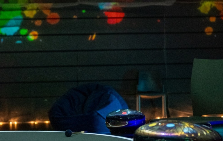 The Sound Nest is an interactive music-making experience set within stunning, synchronised visual projections. Designed for inclusivity, the installation allows groups to have fun creating harmonious music together in response to an animated musical score. Participants are encouraged to lie on bean bags or on the floor to take in the beautiful projections in this zen space.