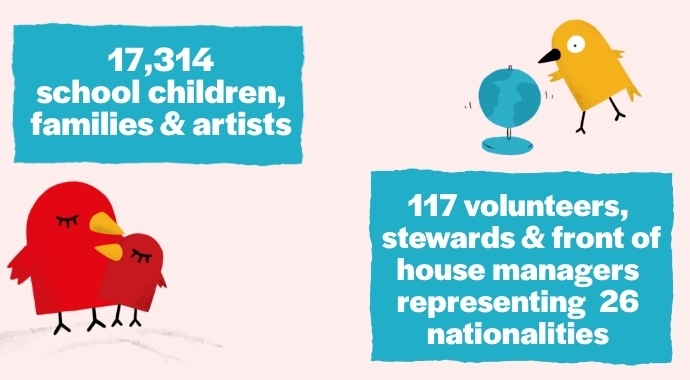 The volunteer programme continues to grow and strives to be diverse and inclusive. In addition to a far-reaching open call, cohorts of volunteers were recruited through direct provision centres and Arts Alive, an arts programme for adults with intellectual disabilities. 26 nationalities were represented across our festival team of 12 front of house managers, 25 stewards and 80 volunteers.