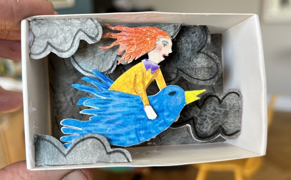 This exhibition explores moments of curiosity and joy through detailed miniature paperworks. Paula has constructed illustrative scenes made from brightly painted paper cut outs that are positioned carefully in layers within tiny boxes.